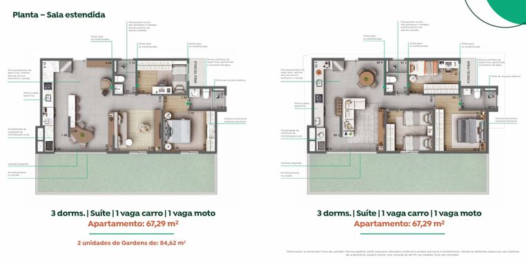 O projeto oferece apartamentos modernos de 2 e 3 dormitórios, com plantas inteligentes que aproveitam melhor cada espaço do imóvel. As unidades possuem metragens aproximadas entre 52 m² e 67 m², com ambientes bem distribuídos, sala integrada, cozinha funcional e opções com suíte e varanda.
